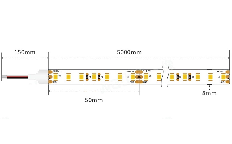 Striscia a LED con doppia potenza selezionabile 5W/8W, unendo le connessioni arriviamo a 12W, con indice cromatico superiore a 90.
